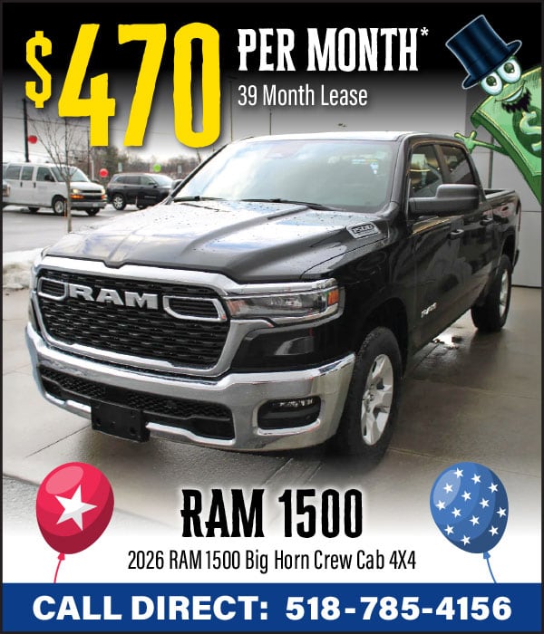 *Stk#L261R72. MSRP: $57,565. Selling price without Lease Loyalty: $53,065 ($4,500 Manufacturer Rebates; Lease only). Selling price with Lease Loyalty: $51,065 ($6,500 Manufacturer Rebates; Lease only). Residual value: $34,539. $2,999 cash down plus tax, first payment, acquisition fee and DMV/DOC fees due at signing. 39 month lease, 10,000 miles per year, 30¢/mile overage. Valid on Select New In-Stock Vehicles only. Must lease through Stellantis Financial Services, must be approved Tier 1 credit to qualify. FICO Score of 720 to qualify. Subject to availability. Photo for illustration purposes only. Special APR: Valid on retail purchase of New, In-Stock 2026 Ram 1500 Big Horn & Laramie Models only. In lieu of rebates; Cannot be used in conjunction with any other coupon, offer, or special unless otherwise specified. Subject to availability. Photo for illustration purposes only. Lease Loyalty Bonus Cash: You or an immediate family member in the same household must be a Current Lessee of a qualifying vehicle at least 30 days prior to the lease of a new vehicle through Stellantis Financial Services; Maximum of two offers per VIN per lifetime of vehicle; Same day purchase required through Stellantis Financial Services; See dealer for complete details.